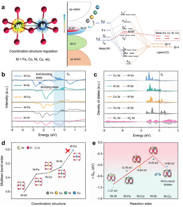 图1 配位结构和吸附能分析:a)M-WO2(M=Fe、Co、Ni、Cu等)的W 5d-M 3d轨道调制示意图。b)W-M键的晶体轨道哈密顿布居(COHP)分析。c)WO2中W-W和M-WO2中W-M的态密度(DOS)图。d)不同W-M构型对应的键极。e)计算了M-WO2(011)在不同反应位置上的氢吸附吉布斯自由能,M代表铁、钴、镍、铜等。