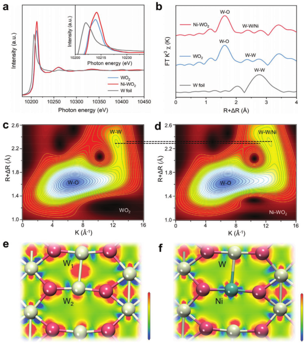 图3 电子结构和配位结构表征:a)归一化的W L3边缘XANES光谱(插图:放大的W L3边缘XANES光谱)。b) WO2、Ni-WO2和W箔的傅里叶变换EXAFS光谱的径向分布。c)WO2和d)Ni-WO2的小波变换的整体轮廓图。e)WO2(011)和f)Ni-WO2(011)的俯视电子密度差从-0.1到0.1 eÅ-3。