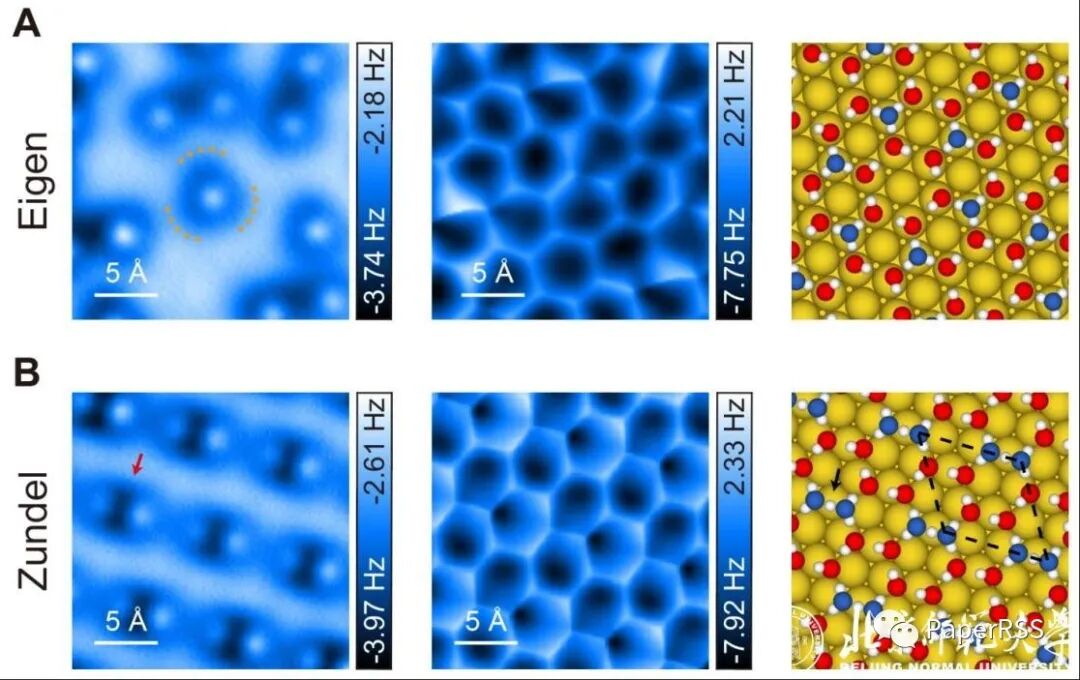 Au(111)表面上Eigen(A)以及Zundel(B)构型水合质子自组装形成的二维氢键网络的AFM实验图(第一列水合离子图;第二列氢键网络图)以及原子结构模型图(第三列)。模型图中,蓝色代表Eigen/Zundel构型离子,红色代表水分子。