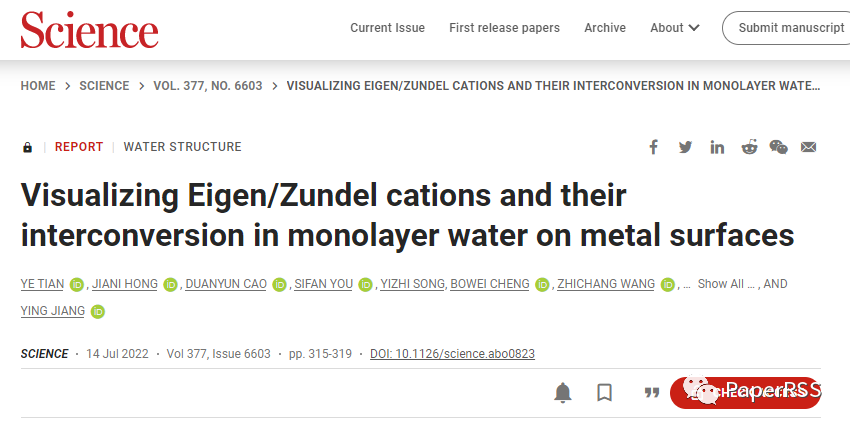 Eigen构型和Zundel构型水合质子的结构模型图。Eigen构型由一个水合质子(H3O+)通过氢键相互作用与三个水分子(H2O)连接而成,该构型只存在普通的、非对称氢键;Zundel构型中氢离子被两个水分子共享,形成对称氢键。