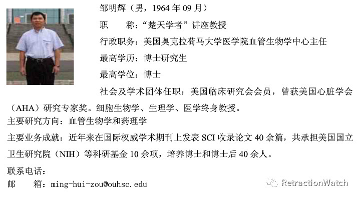 本文来源:募格学堂 10月15日凌晨,美国医学科学院(National Academy of Medicine)媒体负责人通过电子邮件回复澎湃新闻记者称,邹明辉(Ming-Hui Zou)不是该院院士。 图源:澎湃新闻报道 经iMedicines补充整理被撤稿论文为17篇 据资料显示,邹明辉教授,曾先后在法国Pual-SabatierR大学、德国Konstanz大学获博士学位,奥克拉荷马大学内科学系血管生物部负责人,细胞生物学、生理学、医学终身教授,主要从事血管生物学和药理学的研究。 邹明辉简短介绍 中国国内一些高校在介绍邹明辉时,提及的“美国医学科学院院士”: 据湖北科技学院(2012年更名前系咸宁学院)新闻网发布的信息称,邹明辉教授是该校1980级校友,曾先后在法国PAUL-SABATIER大学、德国KONSTANZ(康斯坦茨)大学获博士学位;主要从事血管生物学和药理学的研究;现为“美国医学科学院院士”;2008年经湖北省教育厅评审并正式批准,邹明辉为湖北科技学院“楚天学者计划”特聘教授设岗学科—药理学楚天学者讲座教授;2008年9月19日上午,该校举行了相关聘任仪式。 南京医科大学药学院官网2020年7月1日发布的信息称,邹明辉是佐治亚州立大学主管科研的“副校长”、分子和转化医学中心主任、生物医学终身教授,同时强调了其还是“美国医学科学院院士”。 2022年10月14日,记者查询佐治亚州立大学官网,该校的管理团队——校长和副校长——名单中,已不包括邹明辉。他在研究所的个人简介也撤下关于副校长的介绍,详细简介已无法打开。 此外,美国国家医学院(National Academy of Medicine)官网上也未检索到邹明辉(Ming-Hui Zou)相关信息。此外,佐治亚州立大学相关网页介绍,2008年,邹明辉被选为美国临床研究学会成员。 被撤稿17篇论文 本人曾质疑不公正且不合理 截至2022年10月14日,邹明辉共被撤稿17篇,撤稿原因主要包括图片重复使用、伪造图片和数据。 其中包含9篇JBC ,1篇CIRCULATION (IF=30) ,1篇Circulation Research(IF=17),1篇Diabetes ,1篇PLOS ONE,1篇JOURNAL OF MOLECULAR ENDOCRINOLOGY及1篇American Journal of Physiology- Endocrinology and Metabolism,主要原因是图片重复使用,不适当篡改数据,伪造数据,部分原始数据无法找到。 邹明辉先前被撤稿17篇文章中13篇的列表 例如: 2022年10月13日,邹明辉等人合作在Arteriosclerosis, Thrombosis, and Vascular Biology(IF=10.51)发表的题为"Adenosine monophosphate-activated protein kinase-α2 deficiency promotes vascular smooth muscle cell migration via S-phase kinase-associated protein 2 upregulation and E-cadherin downregulation"的文章被撤回,撤稿声明指出:编辑收到了来自俄克拉何马大学健康科学中心的请求,要求撤销该文章,原因是图4和图6中的数据违规和图像重用影响了稿件中报告的结果和结论。编辑们同意俄克拉何马大学撤回这篇文章。作者不同意撤稿。 2022年10月13日,邹明辉等人合作在Arteriosclerosis, Thrombosis, and Vascular Biology发表的题为"Uncoupling of endothelial nitric oxidase synthase by hypochlorous acid: role of NAD(P)H oxidase-derived superoxide and peroxynitrite"的文章被撤回,撤稿声明指出:编辑收到了来自俄克拉何马大学健康科学中心的请求,要求撤销上述参考文章,原因是图2C和3B中的数据不规范,影响了稿件中报告的结果和结论。此外,图3B“二聚体和单体”蛋白印迹的第1和第4条带是重复的。编辑们同意俄克拉何马大学撤回这篇文章。作者不同意撤稿。 2022年10月1日,邹明辉等人合作在American Journal of Physiology- Endocrinology and Metabolism发表的题为"Suppression of the mTORC1/STAT3/Notch1 pathway by activated AMPK prevents hepatic insulin resistance induced by excess amino acids"的文章被撤回,撤稿声明指出:美国生理学会应俄克拉何马大学健康科学中心研究完整性办公室的要求,撤回这篇文章,原因是图1和图2中的图像重复显著影响了稿件中报告的结果和结论。 2020年9月25日,美国心脏病学会主办的心血管病领域国际学术期刊《循环》(Circulation)在线发布撤稿说明称,作者主动要求撤回一篇论文,主要原因是涉事论文中多张蛋白质印迹图片涉嫌图片重复使用和不当修改,因此遭到质疑;编辑部要求作者提供相关原始数据,但他们仅提供了其中部分数据。虽然第一作者承认数据有不当改动,但坚持其实验结果。出于谨慎考虑,作者撤回该论文。 ...... Ming-Hui Zou(邹明辉)均在论文署名作者中。 另外,一个专业学术打假的网站Retraction Watch在2019年7月8号和2020年1月13号都报道过此次事件,并对邹教授进行了采访。 邹教授承认部分图片确实存在问题,但并非有意,而Journal of Biological Chemistry却直接拒绝对邹教授团队提供的原始数据进行再审核,而是选择了简单粗暴地直接退稿处理。 邹教授同时表示,尽管文章的图片存在问题,但并不影响主要结论,同时其他已发表的文献也都能支持本文章的结论,JBC的撤稿行为是“unfair and unjustified”(不公正且不合理的)。