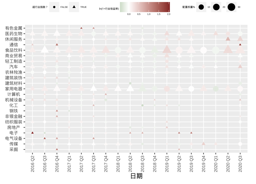 图中三角代表跑赢了相应的行业指数,图形大小代表权重,红色和绿色代表绝对收益的正负。从图中,我们可以看到消费升级长期重配于食品饮料、医药生物、家用电器、休闲服务等行业。并且,在任意一个季度中的任意一个子行业上都没有出现过明显的亏损(绿色的深度)。我们认为这一方面是由于这两年的市场整体上利好大消费板块,另一方面也得益于对高质量龙头的选择。此外,在并不是长期配置的行业,也常有不错的超额收益表现(颜色深度),我们认为这也是她自下而上选股能力的一个体现。