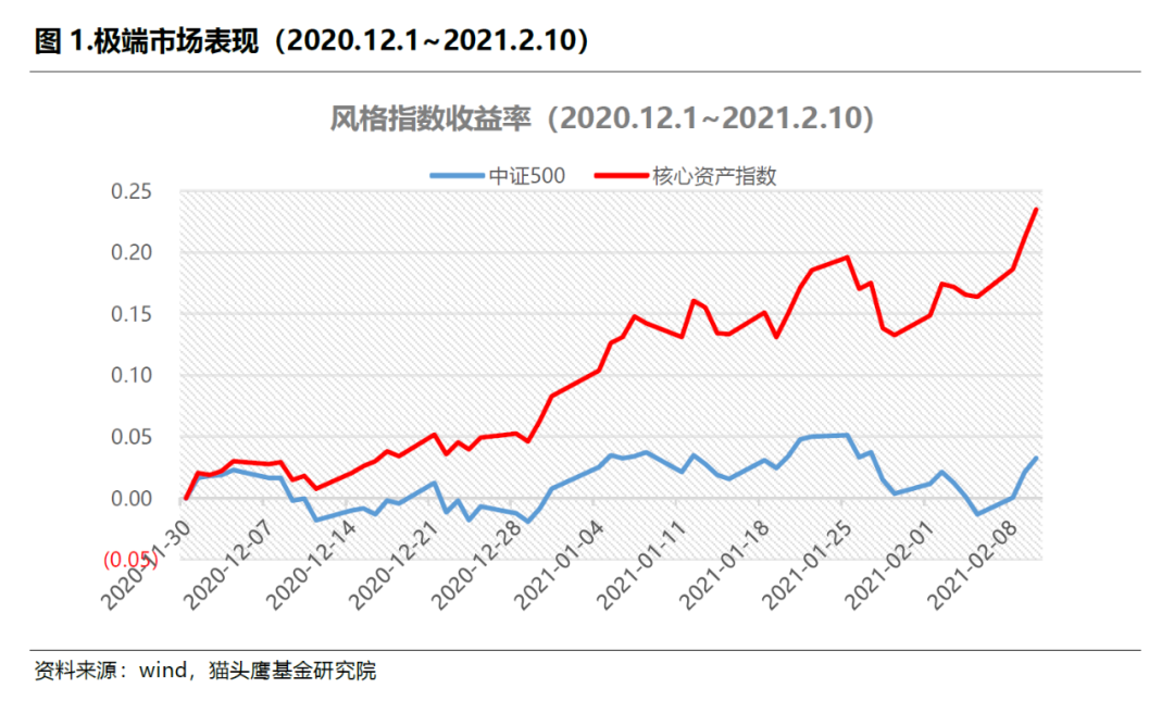 与许多基金经理相比,投资对于刘方旭来说是一件相对轻松的事。原因是,他厘清了一些投资的本质问题和投资的边界,并且异常诚实地看待自己的能力(勇于认怂)。在许多基金经理喊出“绝对收益”口号时,刘方旭并不讳言,他的投资是相对收益目标。语气中带着相当的坦然,简直毫无心理负担。首先,他认为行业有财富管理与资产管理之分,公募基金从事的是资产管理业务,择时问题可以由财富管理职能解决。主动公募基金的任务就是战胜指数。第二点原因在于基金公司对基金经理的考核。“人都会屁股决定脑袋。你怎么考核我,我就怎么去应对和匹配,这是很正常的。”第三点原因在于基金持有人的期限偏好。“持有人才是最终的评价人,他们有他们的标准。我的理解是,现在的持有人多数还是偏短期。”确立相对收益的目标后,有利于基金经理跟随市场指数,战胜恐高心理,坚定坚持淡化择时的决策,而淡化择时更有利于长期收益率的提升。2020.12~2021春节前是市场两级分化的极端时刻。核心资产暴涨,2个多月内贵州茅台、宁德时代、药明康德分别上涨51.76%、69.96%和79.04%。与此同时中小盘滞涨下跌,中证500仅涨3.23%,中证1000下跌4.82%。是跟随泡沫起舞,还是坚守低估却不涨反跌的品种,每日在基金经理心中展开焦灼拉锯。我们访谈过的一部分基金经理,甚至认为该阶段是“从业以来最煎熬的时期”。![]()