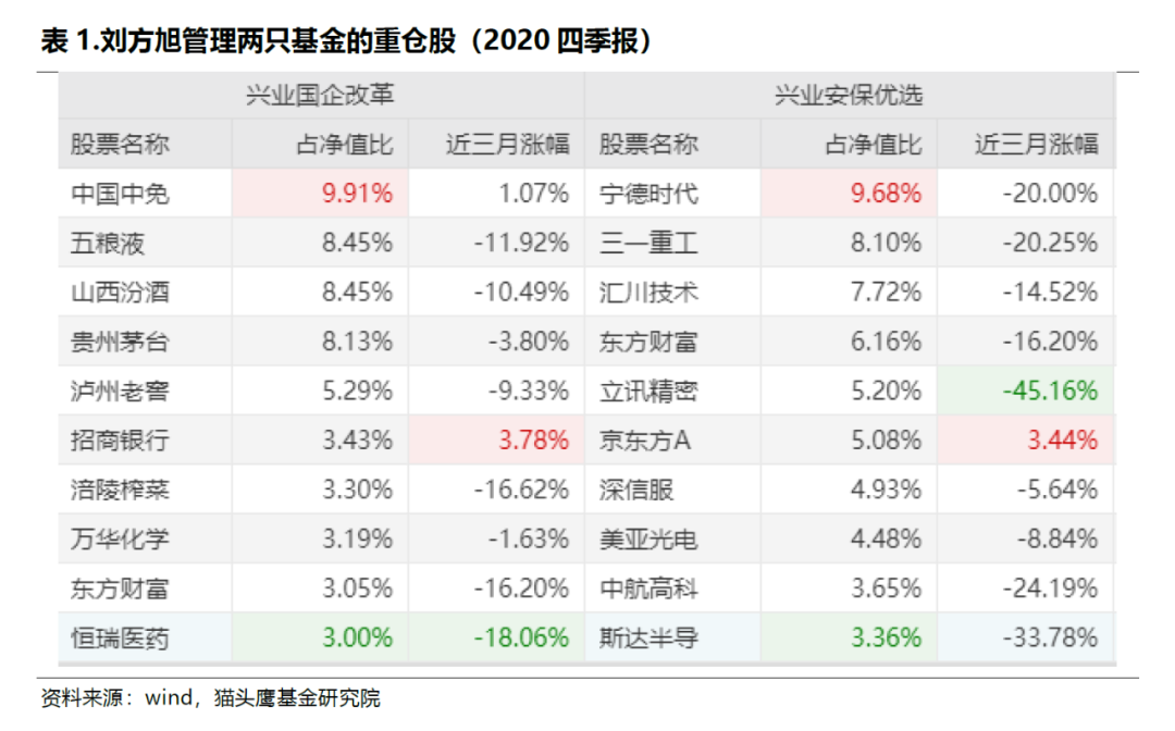 最近关注到的一位基金经理也是这样,他管的两只基金,一只投国企,一只投科技。重仓股是下面这样的。我看了三遍,只找到一只重合。对,确定都是他管的。左手消费、医药外加银行化工中的“茅”,右手科技,来自于电子、机械、新能源车、互联网、军工。是个别现象吗?不,过去两年多,两只基金的持仓都这样左右互搏。这两只投向迥异的基金,业绩还都不错。国企改革基金自2015-12管理以来,上涨162%,排名前5%;科技基金(安保优选)自2018-12管理以来,上涨148%,排名前25%(数据来源:wind)。(国企改革还是更擅长一点。)我们知道基金经理往往是孤傲和苛刻的。要么看不惯市场,“一定要有几次对抗市场”;要么看不惯上市公司,“价值观不正的公司进不了我的池”;要么看不惯行业,“消费只是盾,科技才是最锋利的矛”。但这个基金经理,光看他的持仓和业绩,我倒感到一种海纳百川的度量。我怀着好奇的心情看了连线猫头鹰上的访谈视频。怎么说呢?我感到发现了一位可爱的基金经理。是的,可爱。有的基金经理是精英范,有的基金经理是学术范,有的基金经理是宅男范;刘方旭呢,他操着一口软糯的湖南口音,不急不徐,为你娓娓道来。看好的行业和理由,他和盘托出;自认为能力圈之外的话题,他坦然承认。言语之间,方寸得当。一点儿不装,极接地气。一边看视频,我忍不住一边发了弹幕:- 真的勇士,敢于直面市场的不可测,敢于正视人类的渺小