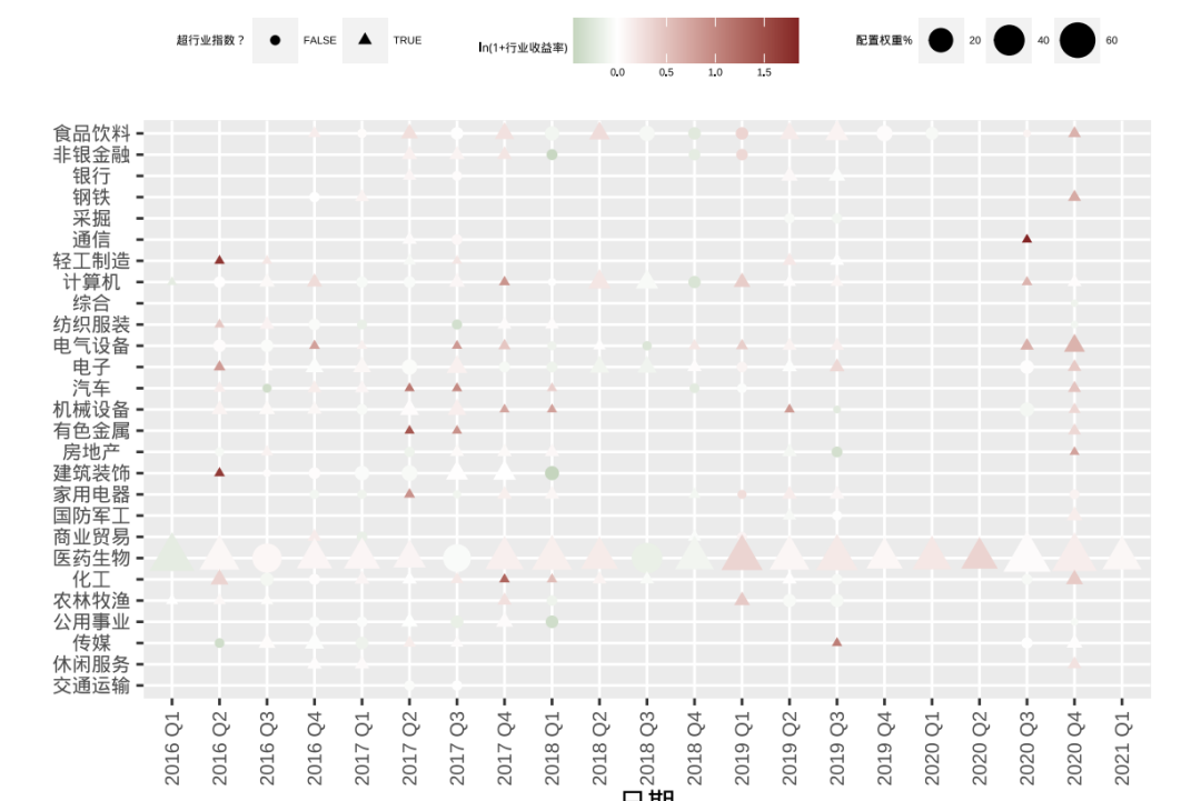 上图的信息量较大,目的是相对直观的展现谭小兵在行业配置上的表现。图标三角形代表跑赢了相应的行业指数,圆形代表未跑赢;图标的大小代表配置的权重大小;颜色表示收益,红色代表获得正收益,颜色越深收益绝对值越大,绿色代表负收益。从图中我们可以一目了然地看到,在大部分时间里,她在所配置的行业中都能取得超行业指数的正收益(大部分为红色三角);同时,除了长期重配医药生物之外,也常在其他行业中有配置,并取得过很好的超额收益(深红色三角)。如我们上文所提到的,谭小兵的行业选择并不局限在医药生物行业中。在28个申万一级行业上,她所经常配置且胜率在50%以上的行业有7个。这其中,医药生物的行业胜率,在全市场排在前10.7%。意味着,长城医疗保健的业绩并不只是来源于医药行业的优秀表现,相对于行业,是有着持续稳定的alpha的。这与我们此前的分析也是相符的。除此之外,机械设备、电气设备、化工、计算机、电子五个行业,不仅长期配置,胜率排名也都在全市场的前50%。这说明,谭小兵过往在这些行业中的投资上,也具备优势。