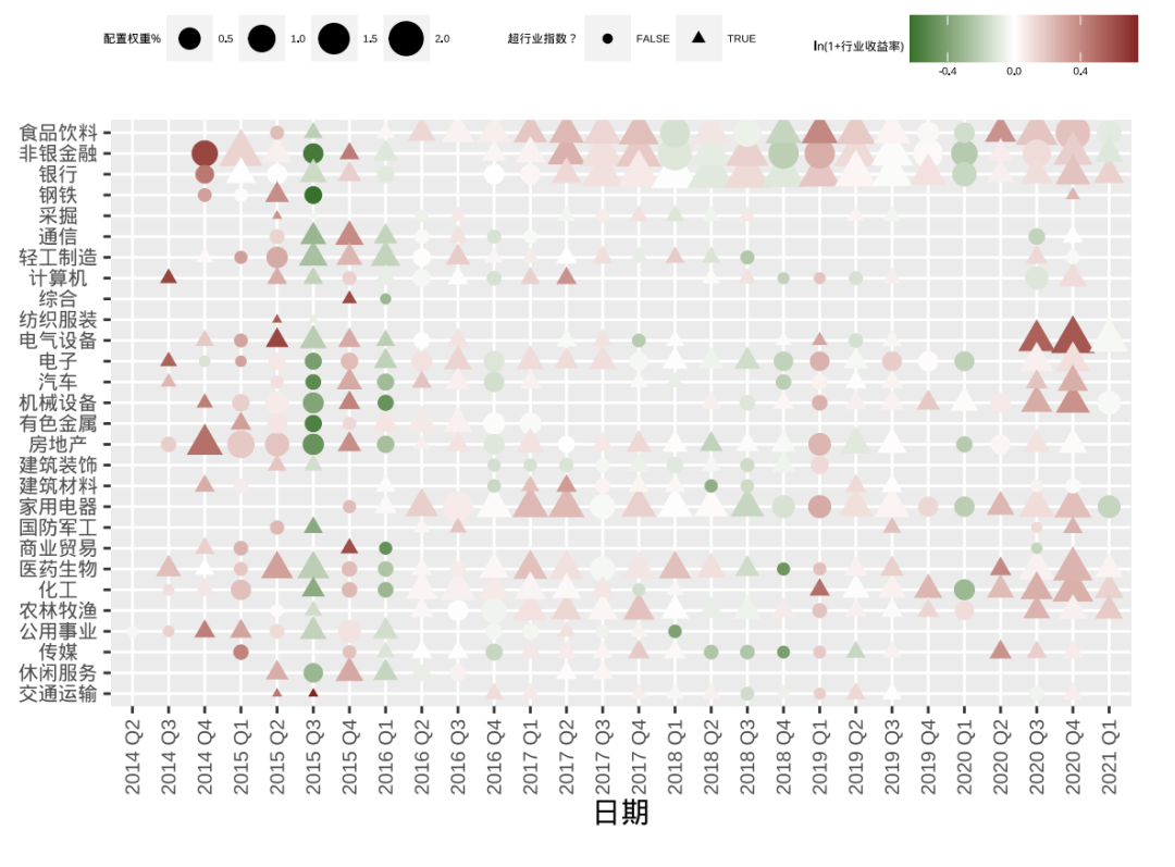 资料来源:猫头鹰补基能手“如果要完全用纯债来做绝对回报,其实很难。债券总有大年小年,小年的时候总是有回撤,而股票就更难了。但是很多时候,这两类资产呈现相关度比较低,或者是负相关的关系,你把它组合在一起的时候,就一定程度上能更好的完成这个任务。”“债券部分跟股票怎么去匹配的话,其实很多时候都要评估这两类资产它自己的价值和它的相对价值。一般来说我会定一个中枢,很多时候在一个市场属于比较正常的状况下,股债的比例就在这个中枢的附近,只有在它特别贵或者是特别便宜的时候,可能会做一些再平衡。”“在一类资产涨的很高或者跌的很惨的时候,全市场都弥漫着那种空气,在其中很难不受影响,我也试图去克服自己这方面的一些障碍。但很多时候,超额回报都是来源于再平衡,希望能在再平衡这块能做一些回报。”我们进一步来观察工银产业债券在信用和利率债上的特点。猫头鹰用两种方法估计了混合债基的久期展示如下图,同时还展示了该基金对应时间阶段的杠杆水平;此外根据基金半年度披露的信用风险敞口,观察债券组合的信用分布情况。1)在久期的调整上比较稳健,比较少去做大的久期选择,2015年以后久期没有大幅度的变化。整体上,久期均值为2.77年。杠杆也是影响久期的重要乘数因子,杠杆率平均在 1.28,最近一个季度降到了历史最低的1.06。2)整体上,信用债占比较高,信用下沉比例在早期很重。在打破刚兑以后,信用下沉比例逐年减少,到目前基本上是在个位数。目前在信用债上,何秀红的主要选择是高等级债券。整体的趋势,体现了何秀红在投资策略上的变化。在调研中她也提到,“2014年之前,是一个刚兑的环境。但是后面市场风变,2014年超日债违约拉开了整个违约风险市场化的序幕。我们看到了这个趋势,2015年以后,我从纯信用债转型成股债混合的策略。并且收缩了所有的信用敞口,基本上就是做高等级信用债,适当参与做比较大的久期选择。”这与数据的表现是一致的,也就是说,何秀红会做一定的久期策略,但是调整不会特别激进。而在信用债上,无论是整体的权重,还是下沉的比例都在减少。我们理解,随着她在股票能力上的进化,特别是在进入到近两年的股票上升市场后,她更偏好向权益类资产要收益,而在债券上则整体保持稳健。我们根据基金公司定期披露的持仓数据,对工银产业债券的股票部分进行分析。图中三角代表跑赢了相应的行业指数,图形大小代表权重,红色和绿色代表绝对收益的正负。从上图中可以看到:1)行业配置非常均衡,比如2020年四季度,持仓分布在了21个申万一级行业上。2)长期且重配的行业(图标大),集中在了金融(如银行、非银)和消费(如食品饮料、家用电器)。结合调研来看,这是她谨慎选择在自己能力圈内进行投资的结果。3)近年来,明显的增加了在科技(如电子、电气设备)、医药等景气赛道上的配置。结合调研来看,这是她主动在能力圈上的拓展,也得益于公司层面对她的研究支持。从个股在整个管理期上的因子暴露来看,她偏好大市值、盈利能力强、高流动性、低估值、低贝塔的股票,有一定的绝对收益的思维。而从21年Q1的最新持仓来看,非常均衡的配置了各个赛道的行业龙头。所以总的来说,她在权益上的做法是:行业均衡配置,并买入赛道龙头。结合调研来看,也反映了她权益能力上的进化。除了股票的beta以外,她也希望获得更多的个股alpha。而通过选择高质量的龙头,以及公司股票投研团队的支持,也使得能力圈的拓展更为稳健。“我在2017年之前,可以看到我持有过的股票基本是两类,一类是金融,一类是消费;主要是2016年的时候开始买的,那两个行业当时买的时候都很便宜,金融股是因为在这个行业里面比较明白,哪些公司做的好,消费行业其实也是跟生活贴的很近,都是买一些偏龙头的这种公司”“从2019年开始,在更多的领域去拓宽自己的一些投资范围。所以从2019年开始我就跟研究部,还有我们公司优秀的投资经理学习。更多的时候会先跟研究员选定某些行业,从他们推荐的股票里面去选,这里面包括制造业的企业,以及一些科技类的企业。”综上所述,我们认为何秀红是一位出色的固收+基金经理。重视回撤控制,熟悉各类资产属性。在信用、利率、转债等等品种上的操作都有着丰富的经验,并在近年来加强了权益能力的拓展。