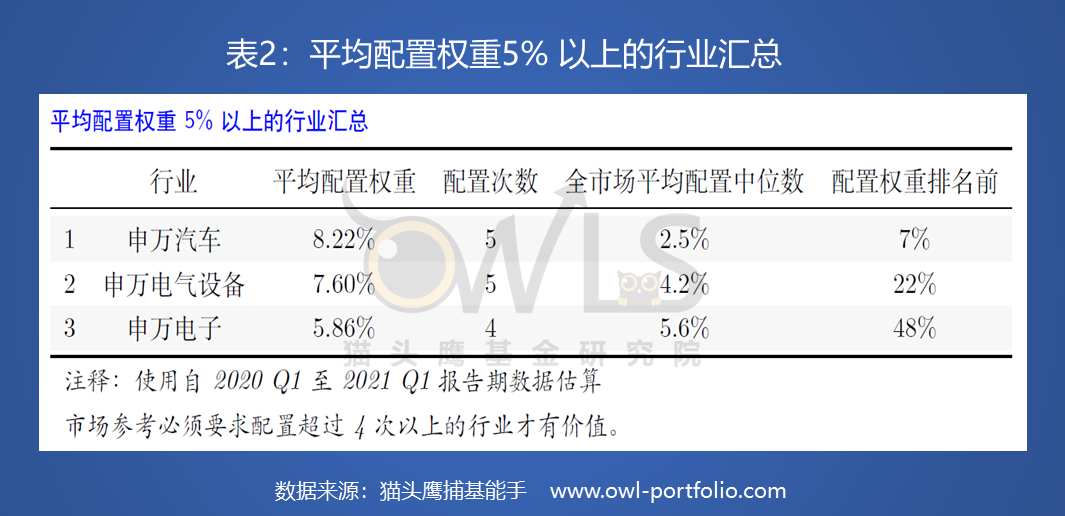 如表2所示,他曾重仓配置过,占基金资产5%以上的行业有3个,分别是汽车,电器设备和电子。