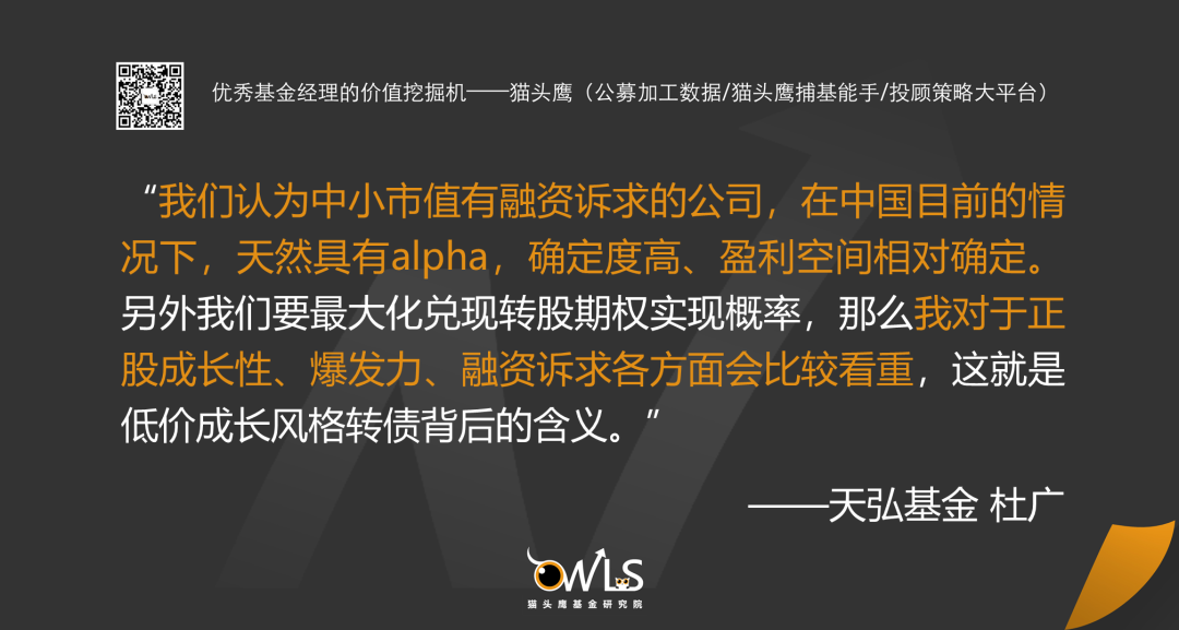 “市场上做转债大致有两种流派,一种是把转债当成股票的替代品,这个是典型的权益思维,是赚beta;第二种,就是我们这种把转债当作一个期权,这个期权目前在国内市场是非常具有价值的,我们定义为转债的alpha,我们聚焦在alpha这一块,没有选择beta,因为这可能会导致聚焦在高价、高波动转债。”在天弘添利的产品公告中可以看到这样一段话:“我们坚持的投资理念是以中低价转债为客户长期获取好的绝对收益,侧重于对成长类、正股波动率高、相对低价的转债投资,以期望去以尽可能高的概率兑现转债蕴含的期权价值”。从交流中猫头鹰也确实感受到,杜广的可转债投资体系是紧密围绕着最大化兑现期权价值这个量化思路来做的。具体包括以下几点:
