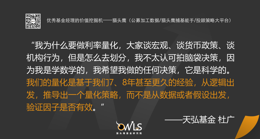 作为一位在转债投资上很有特色的固收+基金经理,天弘基金的杜广为我们提供了一种基本投资“逻辑+量化”的视角:最大化利用转债期权属性博取超额收益。除此之外,杜广的利率债策略也做的很“逻辑+量化”。在猫头鹰连线中,杜广语速平缓,略显腼腆。同时思路指向性强,众多指标设计始终围绕量化最终目标,给人一种很严整的感觉。