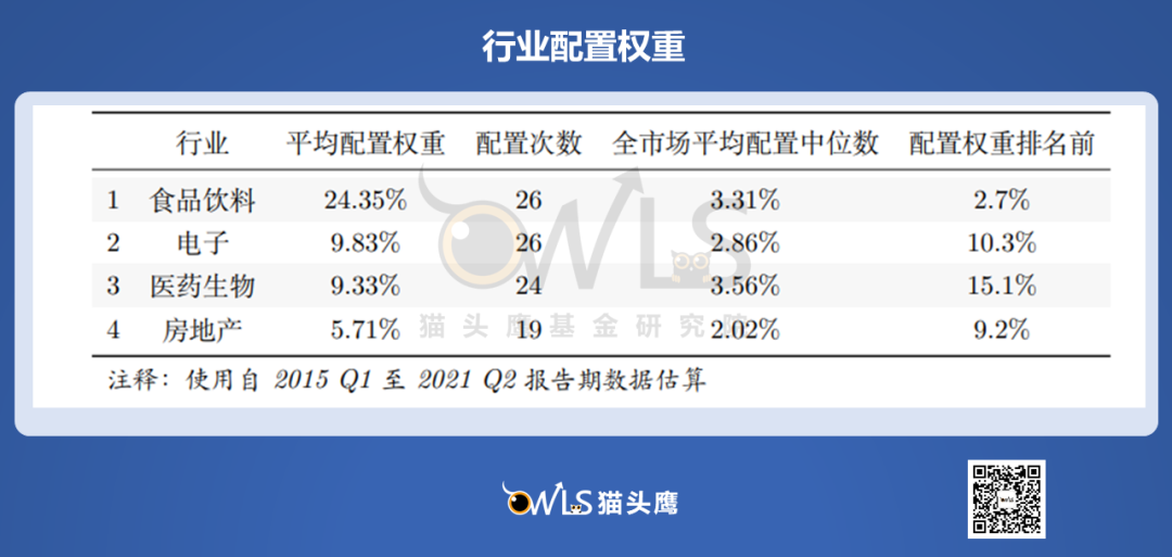 长期来看,苗宇的组合并没有特别集中配置某一个行业,平均配置权重在5%以上的行业有四个:食品饮料、电子、医药生物和房地产。