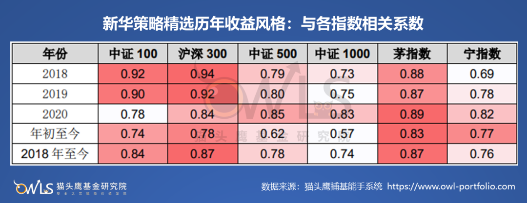 我们将赵强管理的新华策略精选的历史收益率与主要风格指数计算其相关系数,可以看到,