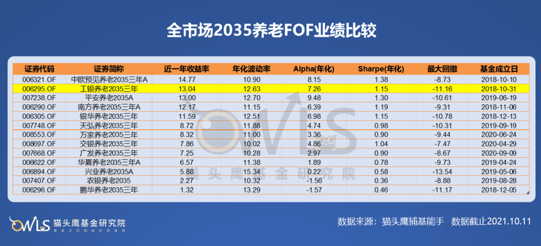 目前,市场上成立时间满1年的2035年养老FOF共13只。若统计近一年的业绩数据可以看到,工银养老2035的近一年收益率排名2/15,年化Alpha排名3/15,年化夏普比率排名5/13,表现位于同类型产品前列。