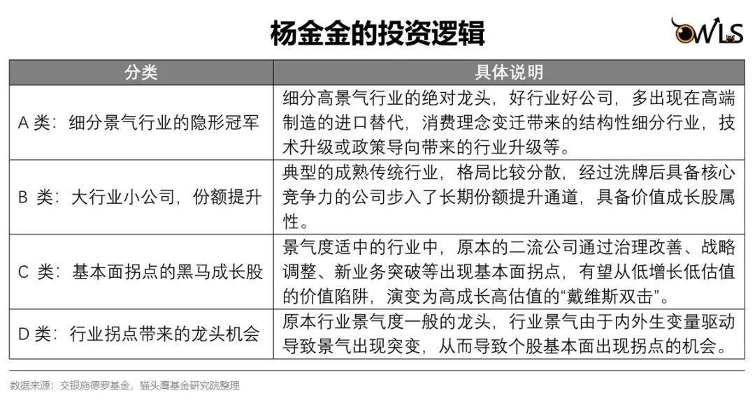 方法论上,杨金金是自下而上的选股型基金经理。有意思的是,个股型选手对持有公司研究深入,组合中通常会体现出高集中度的特点。而杨金金的组合集中度极为分散,2021年三季度的前十大持仓占基金资产净值的比例约为26%。低集中度可以有效分散单只个股滞胀时的压力,降低组合波动。杨金金会有意识的降低个股之间的相关性,并且避免与宏观经济相关度过高的公司,通过基金定期报告可以看出,组合中前十大个股也都处于不同的细分赛道。他将不同的投资逻辑划分为四个类别,这样的做法有两个好处:第一,投资逻辑的归因经验积累,能够形成正向反馈,帮助他更好的理解不同类型投资的主要逻辑和风险点。第二,通过对个股进行分类刻画,也更容易去把握组合整体的高胜率。