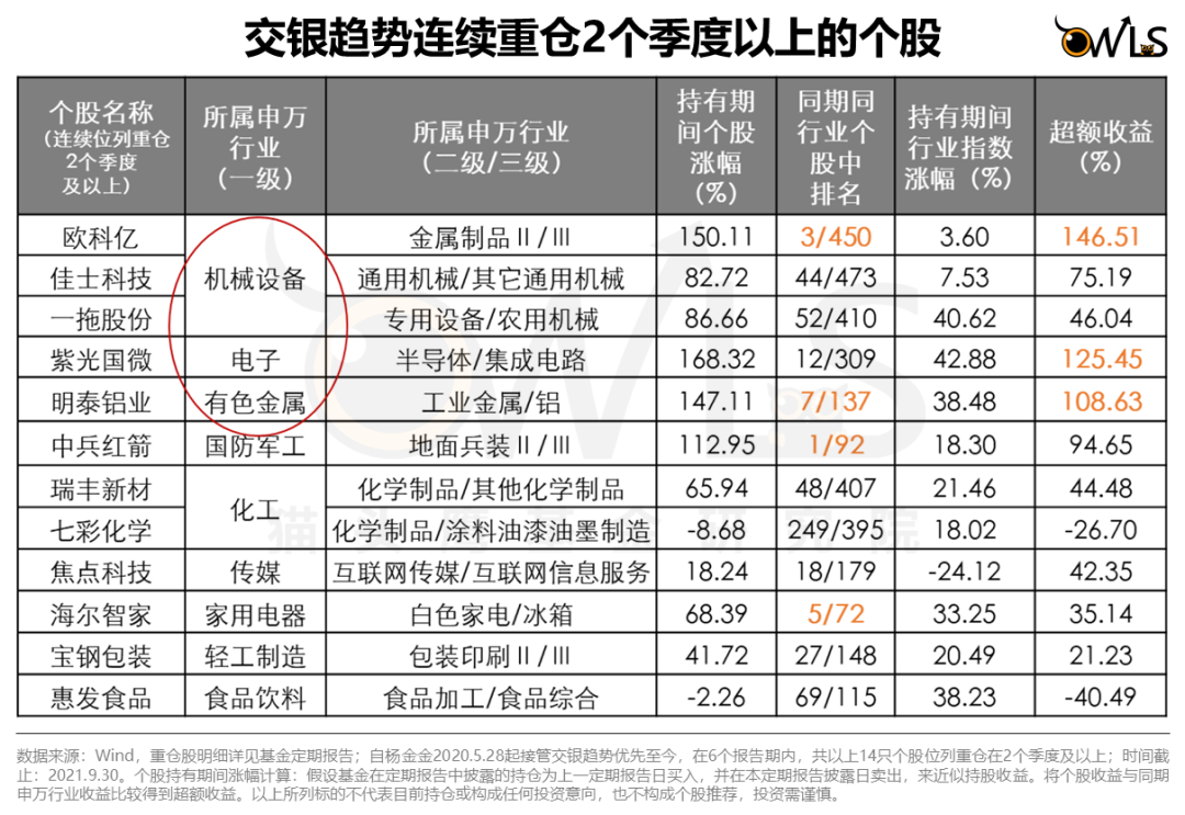 这也印证了他投资方法论的知行合一,正如在基金定期报告中多次提到的“长期集中注意力于挖掘新的产业趋势及成长龙头,寻找能够长大的中小市值公司,与优秀的企业家共同成长。”他认为中国经济的发展到目前的阶段,精细化和专业化分工下的小公司也有很多优秀的产品或服务。并且,小公司的企业家同样有着出色管理能力和品质。企业家精神并不存在“规模效应”。杨金金自下而上择股能力较强,过往的行业研究经历和能力圈,为他的投资方法提供了支持。杨金金拥有“材料工程学士+金融硕士”的复合学历背景。在研究员期间,他主要覆盖家电、有色、化工、机械等行业,对中游制造板块有着多年的研究经验。机械和化工这类行业的特点,正是细分行业众多,有着大量的细分小龙头能够挖掘。从数据上来看,他并没有跟风追逐热门赛道,而是坚守于能力圈,在认知范围内做选择。以交银趋势连续重仓2个季度以上的个股为例,可以看出,在机械、电子、有色金属等行业获取的个股超额收益更高。