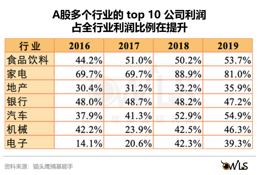 从历史数据来看,A股其实已经出现了龙头企业依靠资金优势、人员优势、品牌优势,不断在行业内蚕食中小企业市场份额的现象,无论是消费、周期还是制造业,细分行业里市值最大的10家公司利润占全行业利润的比例,在2015-2019年间持续提升。