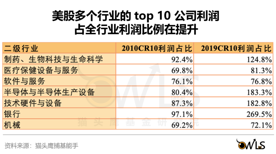 这个现象,也发生在美国、日本等成熟市场上。通过对比2010年和2019年上市注册地在美国的企业利润分布,可以看到,美股上的医药、医疗设备、技术硬件、软件、银行等行业,尽管商业模式不同,但趋势都是龙头越来越占优势。