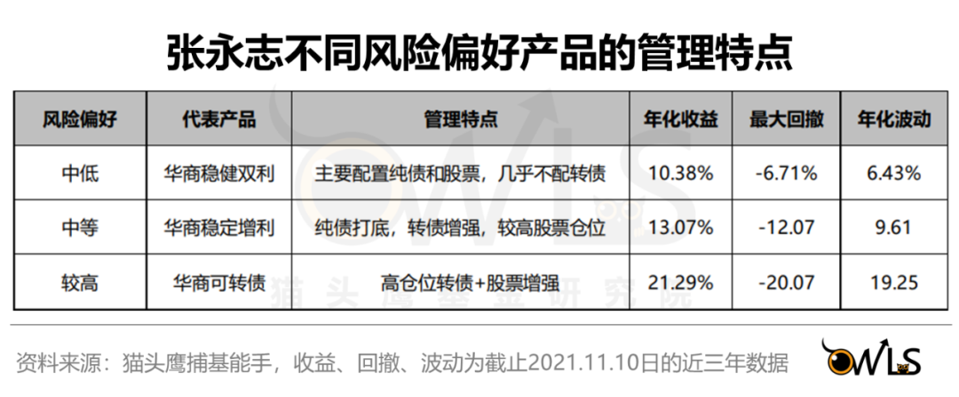 整体来看,张永志的管理时间长,管理产品类型也较多元化。时至今日,已经逐渐形成了清晰的产品定位。定位不同,管理方式也截然不同。