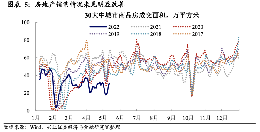 居民端:地产低迷叠加购房、消费活动受限,新增贷款再度转负。4月居民贷款同比少增8250亿元,其中短期贷款同比少增1930亿元,中长期贷款同比少增5520亿元。此外,新增居民短期贷款与中长期贷款均跌入负值,指向疫情对居民购房与消费活动的拖累较大。从高频的商品房销售数据来看,5月以来居民购房活动仍未见明显改善,短期内地产低迷以及疫情扰动对居民中长期贷款的拖累或仍将延续。