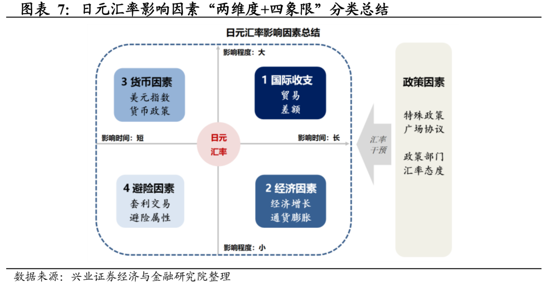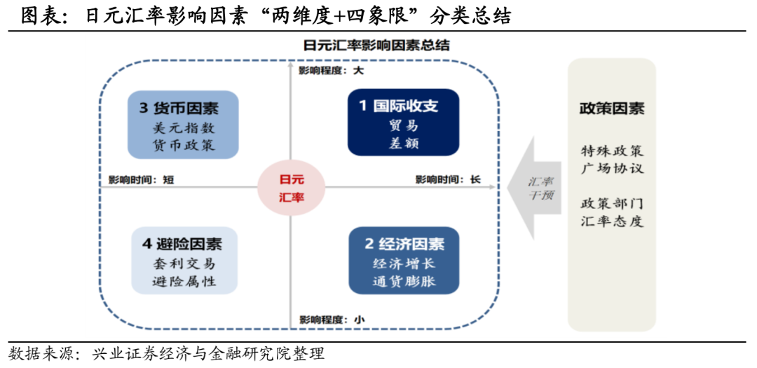 日元汇率影响因素总结:“两维度+四象限”分类。根据以上,将日元汇率影响因素,按照影响周期长短、影响程度大小,进行“两维度+四象限”分类: