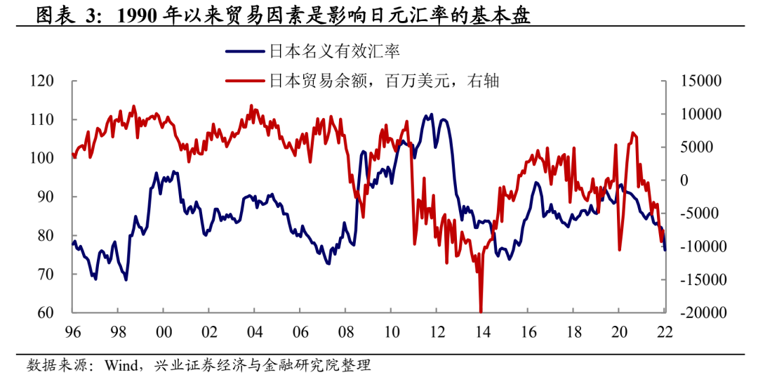 规律二:长期看,影响日元汇率的基本盘是贸易顺差。1990年以后,广场协议对日元汇率影响消退,日元大幅升值趋缓,日元汇率与日本贸易差额之间体现出长期趋势一致性,贸易因素成为影响日元汇率的基本盘。1990年以来随着日本贸易顺差变化,日元汇率呈现两阶段特征:(1)1990-2012年,日本维持贸易顺差、日元汇率呈现升值趋势。(2)2013-2022年,日本贸易顺差下行,日元汇率呈现贬值趋势。