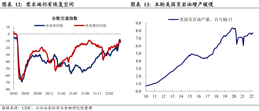 需求端:交运实际上仍未恢复疫情前水平,年内原油需求增长仍有空间。全球原油消费量增速与全球经济增速相关性较高。在经历2020年的疫情冲击后,2021年是全球经济增速的快速反弹期,2022年经济增速较2021年会有所回落,但不应以此推断原油需求走弱。从高频的全球交通指数来看,实际上主要经济体的交通活动仍有15%的恢复缺口,因此虽然原油需求的增速相较2021年将会放缓,但整体需求仍然不弱。
