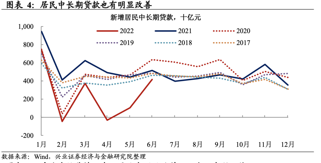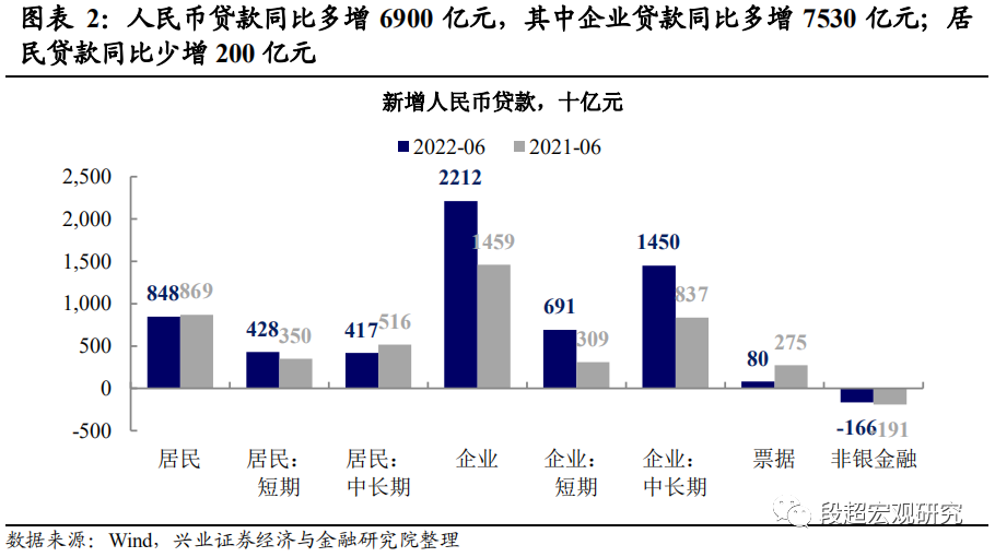 企业端:中长期贷款增多、票据融资减少,结构有明显改善。6月企业贷款同比多增7530亿元,其中中长期贷款、短期贷款分别贡献6130亿元、3820亿元,票据融资则同比少增1950亿元。整体看本期企业端贷款无论是总量上还是结构上均有明显改善。