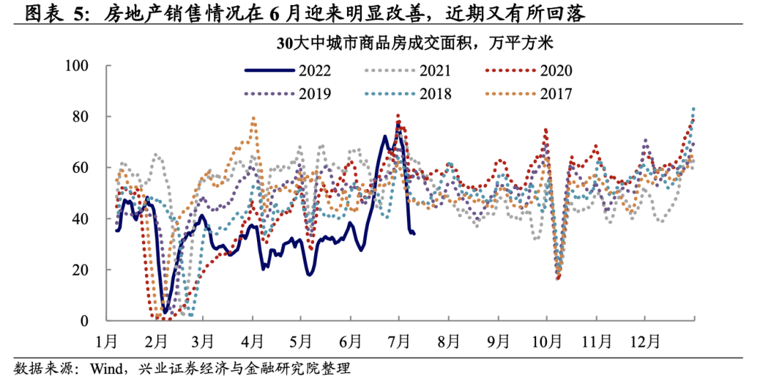往后看,疫情扰动再起叠加地产销售再度转弱,需求端的改善仍然需要政策的持续呵护。7月以来国内疫情再次反弹,当前程度弱于3、4月份,但对经济活动恢复、企业信心恢复或产生一定扰动。此外,从地产销售数据来看,商品房销售7月以来再度转弱,指向居民对地产市场的信心仍未完全恢复。往后看,如我们在中期策略中所提示,居民消费端、企业投资端、地产市场的恢复都需要时间,这意味着政府主导的刺激政策仍将具有延续性(详见《东边日出西边雨——2022 年中国宏观中期报告》)。