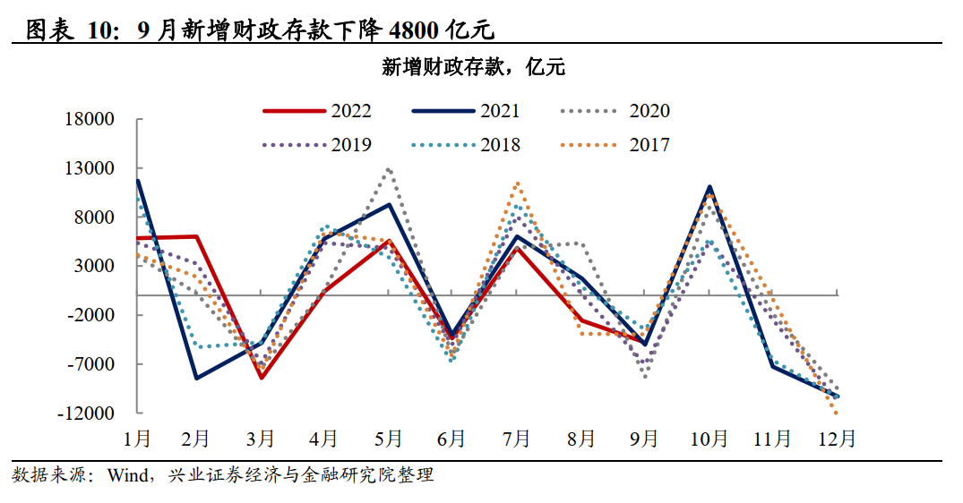 政府债券融资继续同比少增,但财政发力落地状态延续。2022年9月,新增政府债券融资5525亿元,同比少增2541亿元。经历前期专项债发力后,政府债券融资连续2个月同比少增,这是专项债冲量高峰期过后的自然回落。9月新增财政存款下降4800亿元,比上月下降幅度扩大,反映财政存款继续保持下放节奏,财政发力持续处于落地显效阶段。