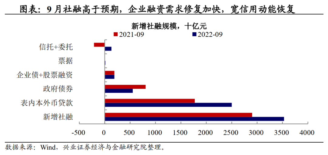 9月社融数据显示企业融资需求修复加快。9月,新增社融主要受贷款以及信托、委托贷款拉动,稳增长政策带动效果扩大显现,企业融资需求加快修复。