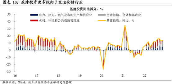 基建投资更多投向交运、仓储行业,体现政府“保供应”的政策导向。