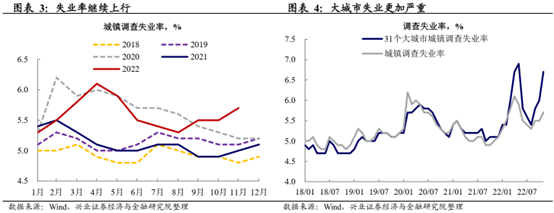 受疫情扰动,失业率继续上行且大城市失业更加严重。自8月以来,城镇及31个大城市城镇调查失业率持续反季节性抬升。值得注意的是,31个大城市城镇调查失业率抬升较整体城镇调查失业率更加明显,11月为6.7%,接近2022年5月的高点(6.9%)。这或是因为11月疫情较严重地区多为各省的省会,因此大城市的失业率较全体城镇的失业率更高。