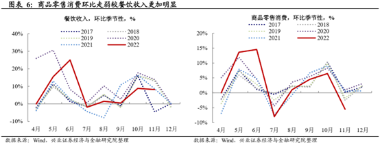 11月餐饮消费下行符合预期,但商品消费下行幅度更大值得关注。11月社会消费品零售当月同比为-5.9%,相较上月下行5.4个百分点。其中餐饮消费同比为-8.4%,下滑0.3个百分点;商品零售同比为-5.6%,下滑6.1个百分点。在疫情压制下,餐饮消费增速保持疲弱符合预期。但是,商品消费下行幅度较餐饮更大值得关注。从环比来看,餐饮消费环比与历史同期均值相当,但是商品消费环比则明显弱于季节性,延续了10月的疲弱趋势。这或表明,除了疫情冲击之外,内生消费动力可能也受到了一定影响。
