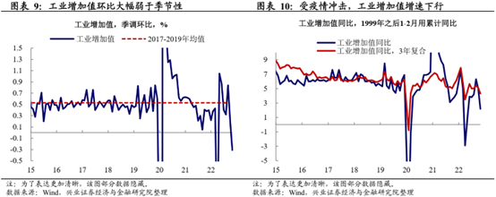 2022年11月规模以上工业增加值同比为2.2%;固定资产投资同比0.9%;社会消费品零售同比-5.9%;对此我们认为: