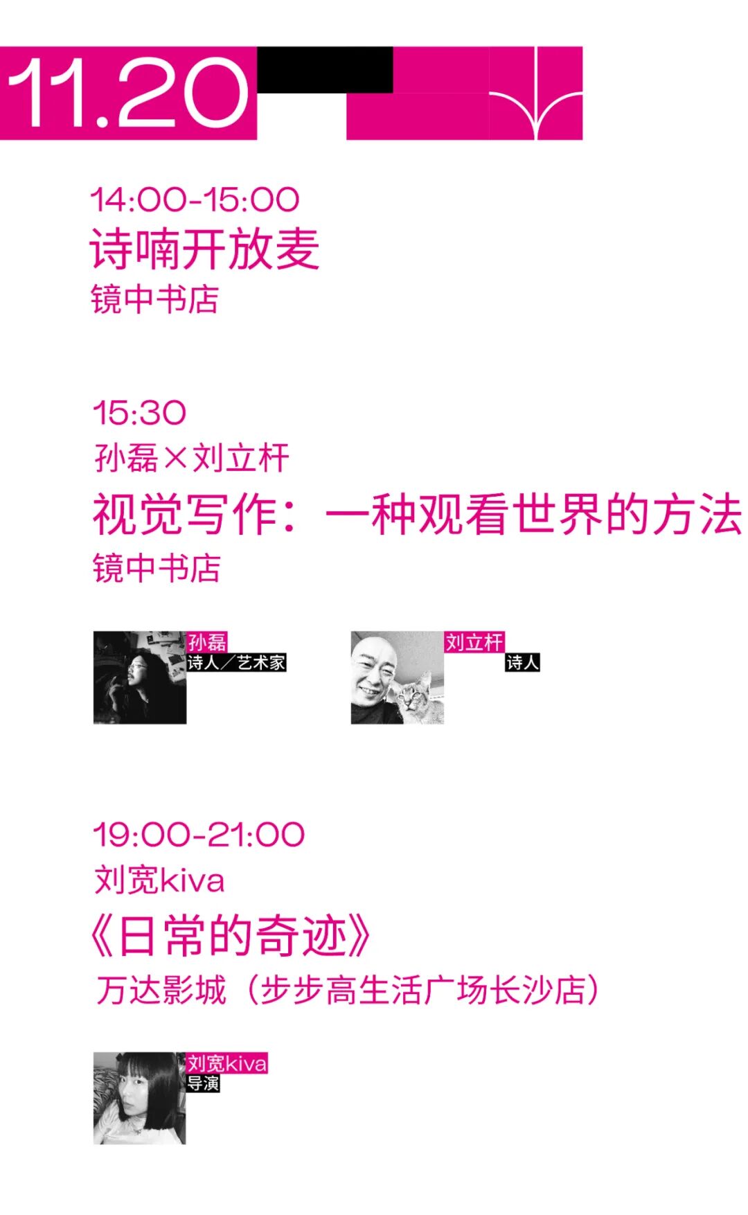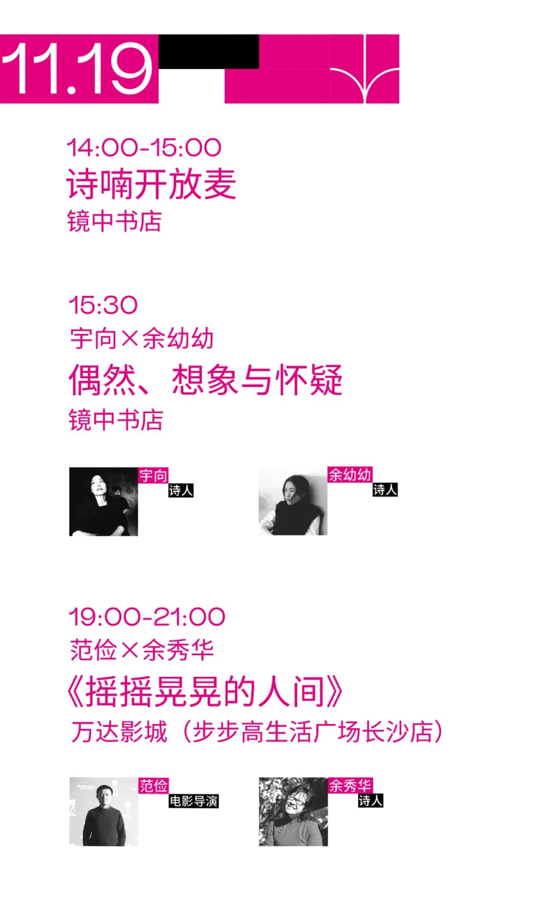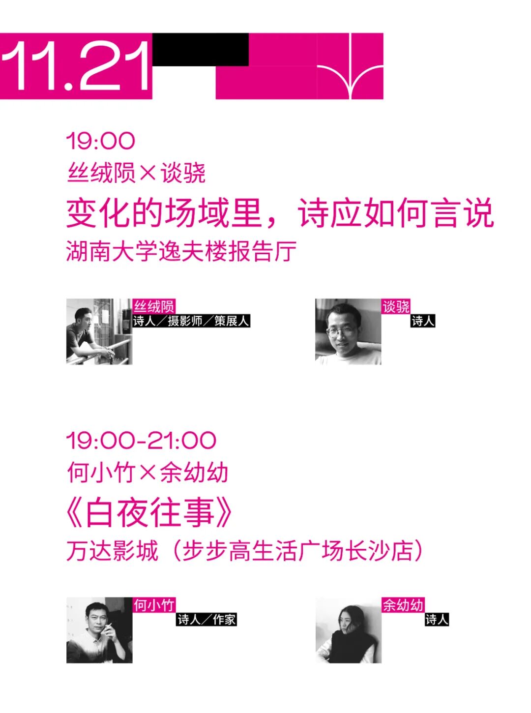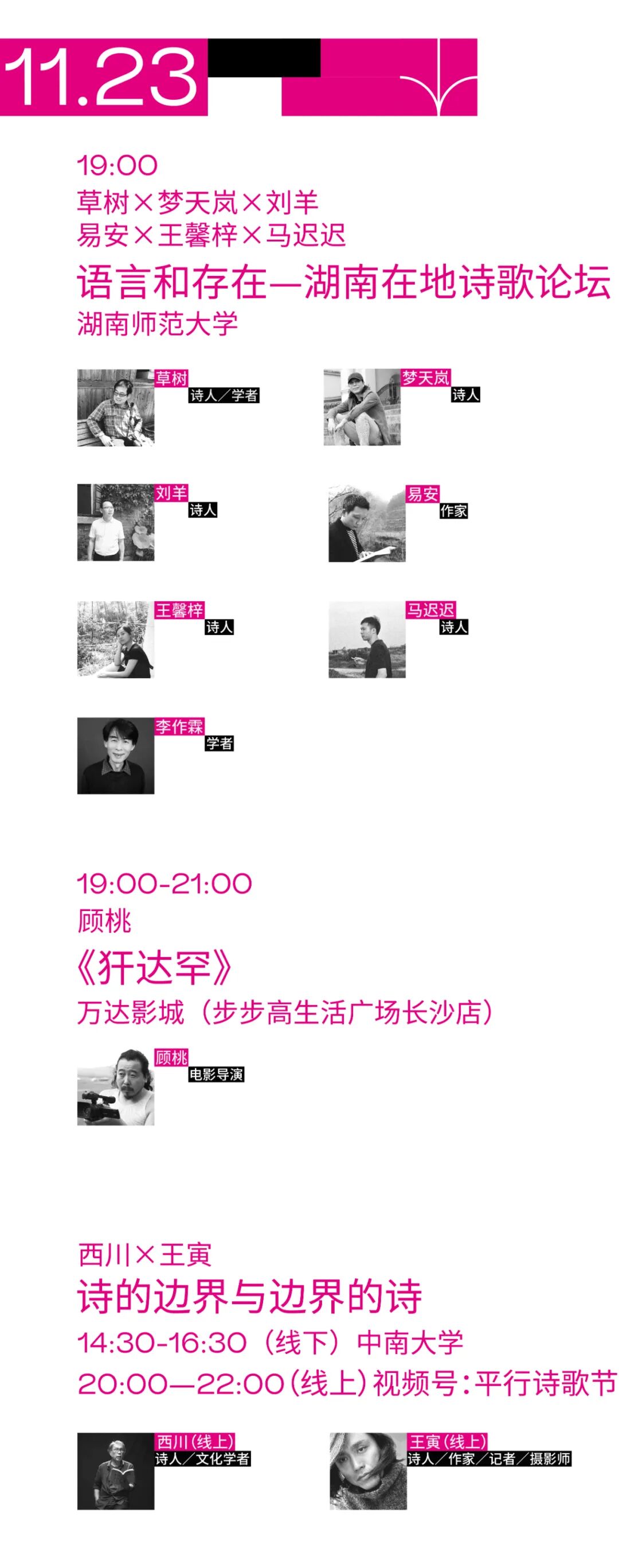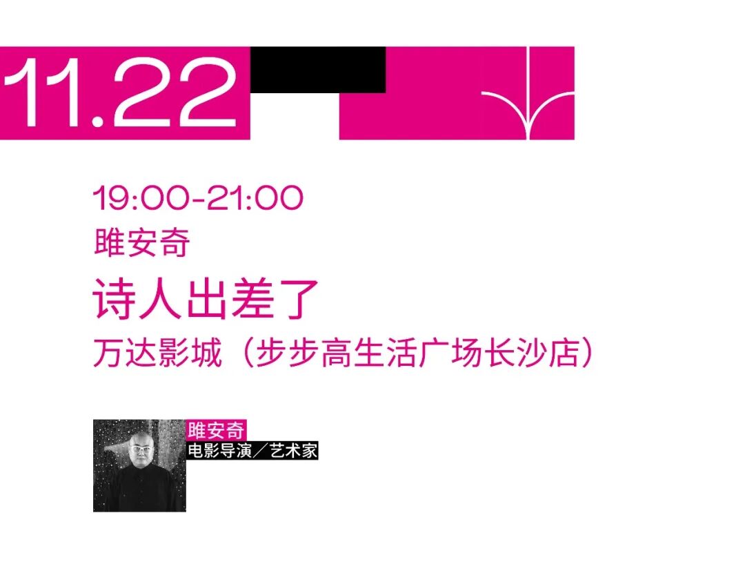 本届平行诗歌节,以诗歌为支点,以沙龙、对话、展览、诗喃、放映为表达的方式,与生活在城市中的人们一起,从长沙岳麓山下出发直至无垠的线上,寻找与在地生活,乃至与世界之间的回应方法。![]()