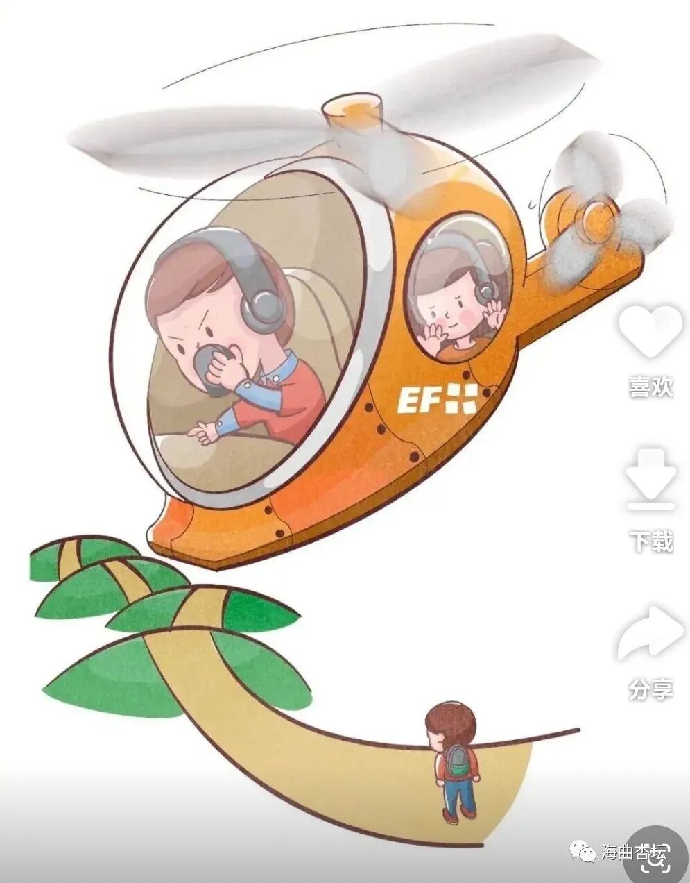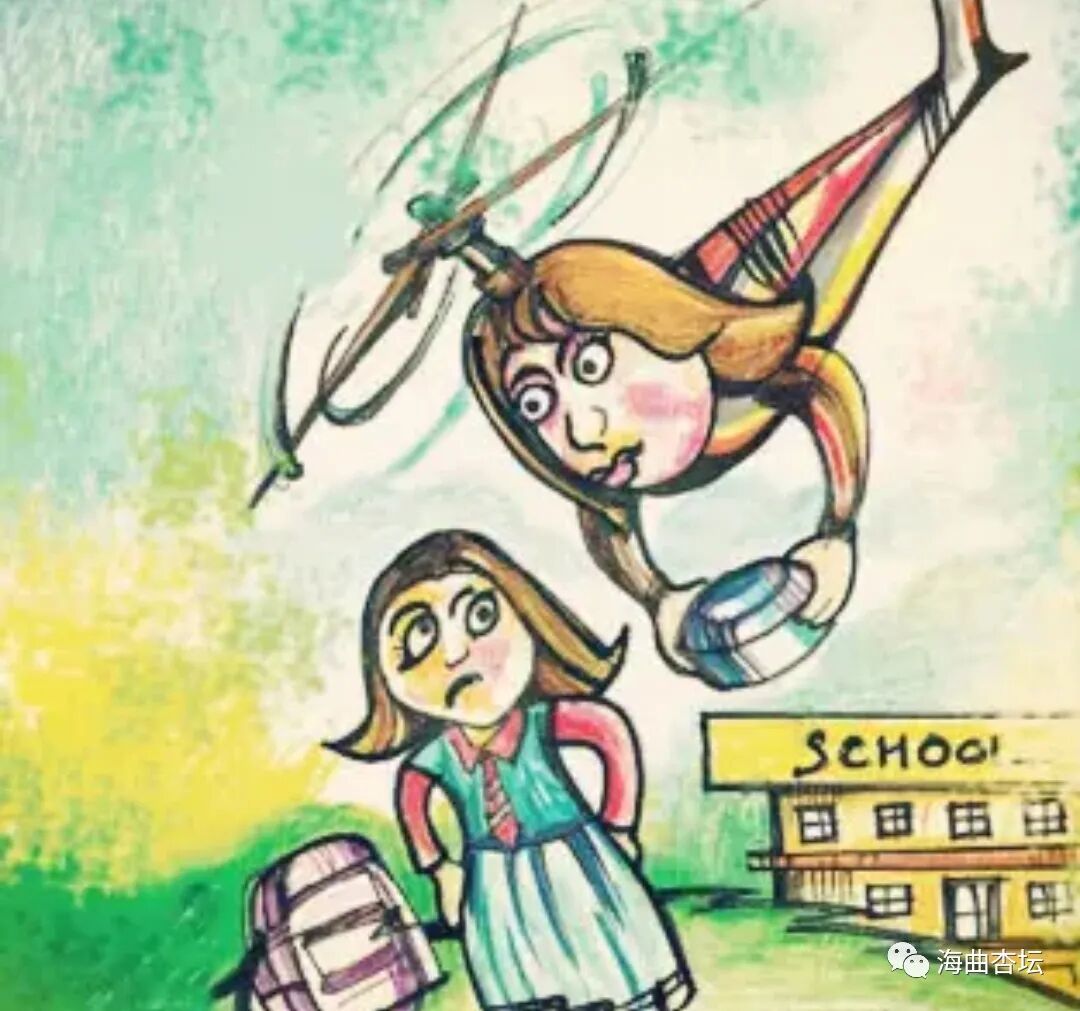 “直升机父母”是一个新名词,意思是父母像直升机一样,随时在孩子的上空盘旋。时刻准备着,在孩子遇到困难时立即降落,挺身而出为孩子解围。