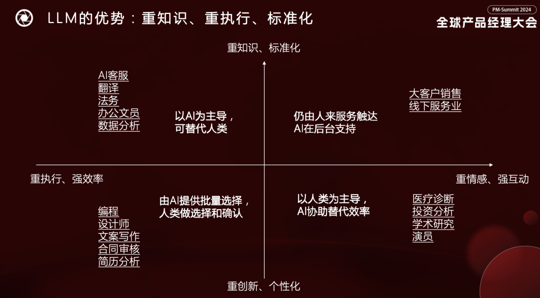 为进一步剖析当前 AI 应用发展现状,姚欣用一个坐标轴来展示任务的可衡量性和标准化程度加以说明。他表示,左上角的任务如客服、翻译、数据分析等是最容易标准化衡量,这类任务最适合当前的大语言模型处理;左下角的任务如编程、设计、文案写作需要 AI 辅助创意,但最终仍需人类干预。至于右下方的任务,目前还很难仅靠大模型实现,可能需要其他工程技术手段的支持。