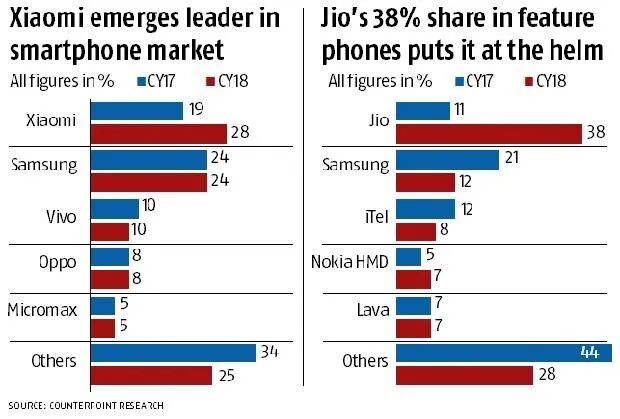 依靠母公司石油化工业务的输血,RJio秉承“能亏损就尽量别赚钱”的策略和竞争对手大打价格战,直接把流量价格压缩到了从前的十分之一。从价格战开打到抢走一亿用户,RJio只用了170天。踩着对手的累累白骨,RJio直接从内部创业项目晋升为印度最大电信巨头。几乎是同一时间,在安巴尼的主导下,RJio策划了一套精准的组合拳——2016年,RJio推出了印度版小米——LYF手机,价格只有2999卢比(约285元),和上面的套餐捆绑销售。2019年,印度的人均月收入是11254卢比,这意味着印度人用一周的收入,就能买一台上得了Google、刷得了Facebook的手机,流量还特别便宜。短时间内,LYF一跃成为印度第三大手机销售品牌。不是说好的华米OV占领印度吗?其实不然。中国四家品牌瓜分的只是印度智能手机市场,而市场规模更庞大的,是廉价、结实、易用的功能机;在这片战场,LYF市占率达到了38%,成为5.5亿印度功能机用户首要、甚至是唯一的选择。![]()