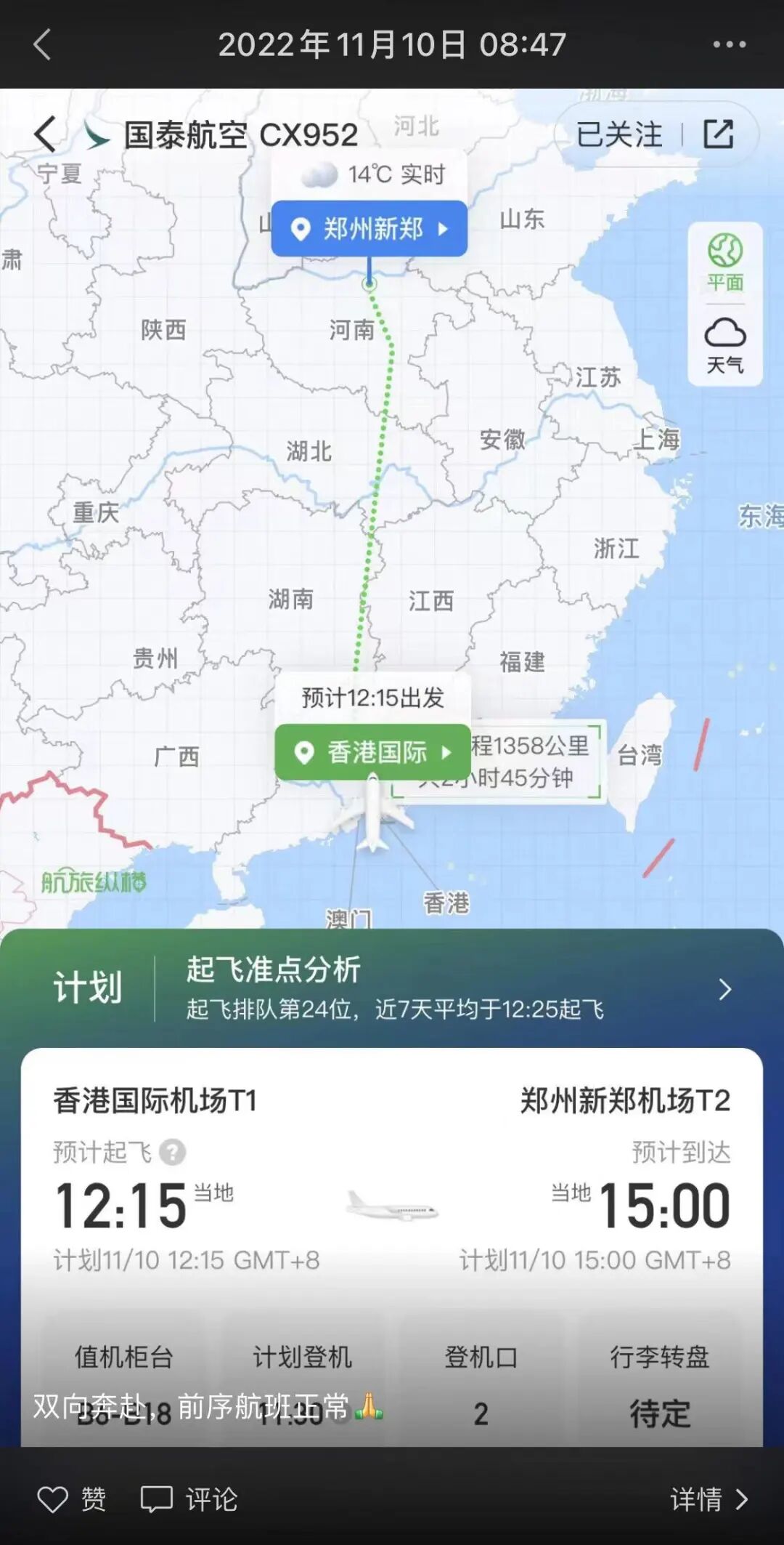 11月7日凌晨两点多,邢台市静默。郑州疫情严重,彭飞的航班被取消了。他只能继续看航班,这次从郑州飞香港,再到曼谷,最后去多哈。没几天,郑州机场取消了全部国内航班,但飞往香港的航班得以保留。出发前彭飞没法去银行,只能找邻居兑换了2000元现金,以备路上不时之需。