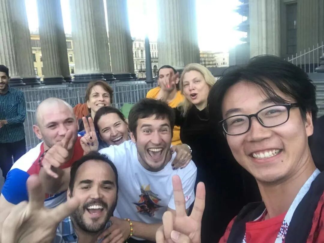 在俄罗斯,王继成(最右)和各国球迷踢球