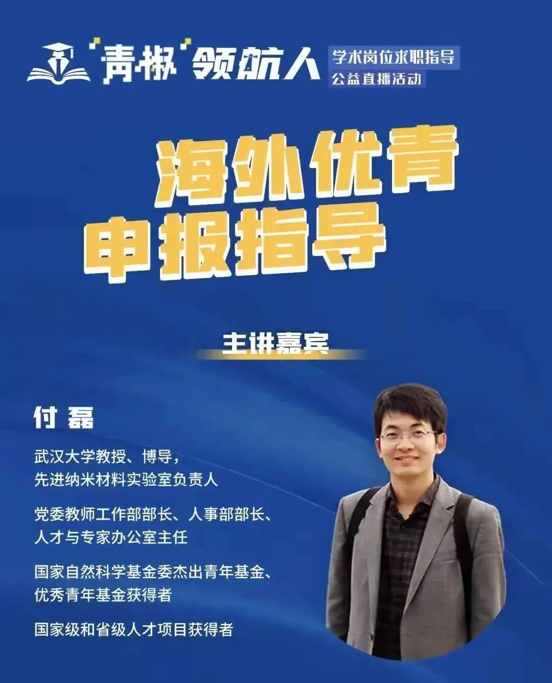 以“海外优青申报指导”为主题,第三期“青椒”领航人公益直播活动于前日开播!中国教育在线·学术桥特别邀请武汉大学的四位教授作海外优青项目申报指导和申请经验分享。