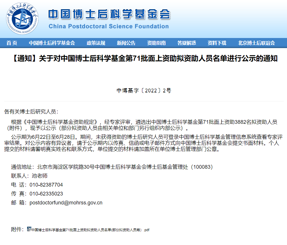 6月22日,中国博士后科学基金会公布了第71批面上资助拟资助人员名单,经专家评审,遴选出3882名拟资助人员。