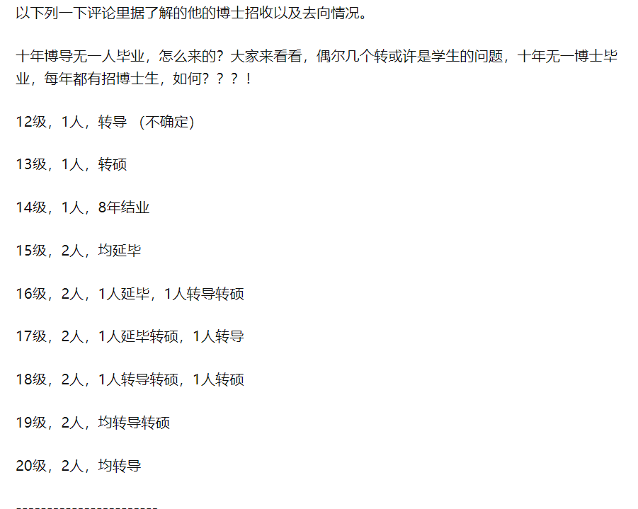 据网友统计,该教授博导十年,手下学生转导的转导,转硕的转硕,竟然无一人毕业。