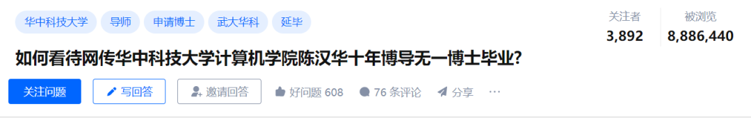 近日,知乎上一个提问《如何看待网传华中科技大学计算机学院陈汉华十年博导无一博士毕业?》火了,目前已超过888万浏览,被推上知乎热榜。