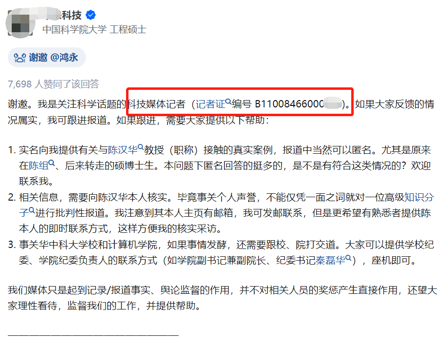 据知乎一名自称科技媒体的记者表示,已经关注到相关事件。并已经开始收集相关资料,目前已有多名曾经在陈姓博导组内学习的学生联系到该记者。