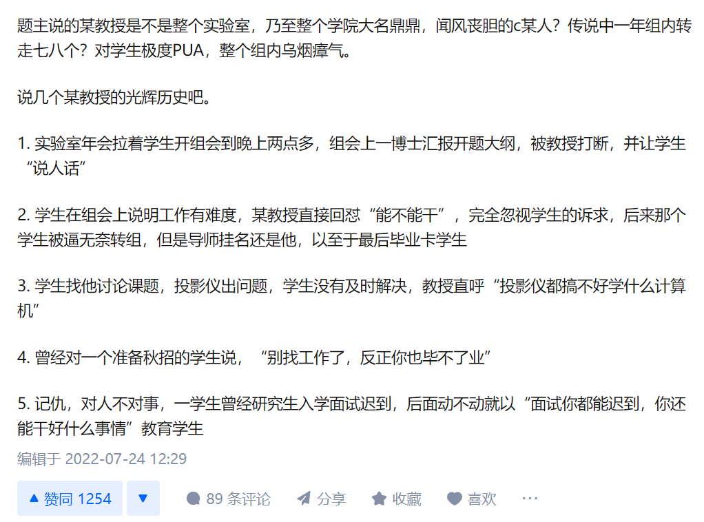 缺乏对学生的基本指导,疑经常语言暴力 ,PUA学生。还有网友爆料,该陈姓博导对于组内学生的课题研究基本不会给予指导,并且言语消极,非常打击学生的积极性。对于学生的疑问,该博导则经常以“这里不行,我也说不出应该怎样,但是要改”,“你就说能不能干,别人都能干”等方式表达。