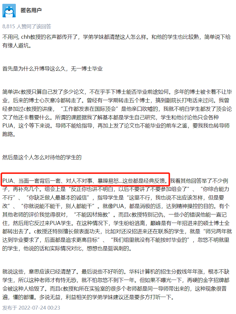 据多位自称陈姓博导学生前学生及和课题组有接触的网友爆料,普遍反应陈姓博导的“多个问题”:性格怪癖,PUA学生,卡学生毕业,只让发顶会……