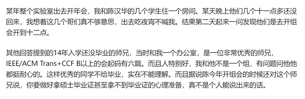 多名网友提到,陈姓博导酷爱卡着手下博士生不允许其毕业,即使发了顶会论文也不允许毕业。尤其是组内“大师兄”,发了无数顶会,做了无数项目。最严重一次几乎一周没睡觉,没洗澡,但依旧被拖8年。