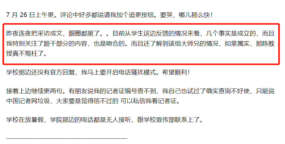 “目前从学生这边反馈的情况来看,几个事实是成立的,而且我特别关注了题干部分的内容,也是吻合的。而且还了解到该组大师兄的情况,如果属实,那陈教授真不冤枉了。”