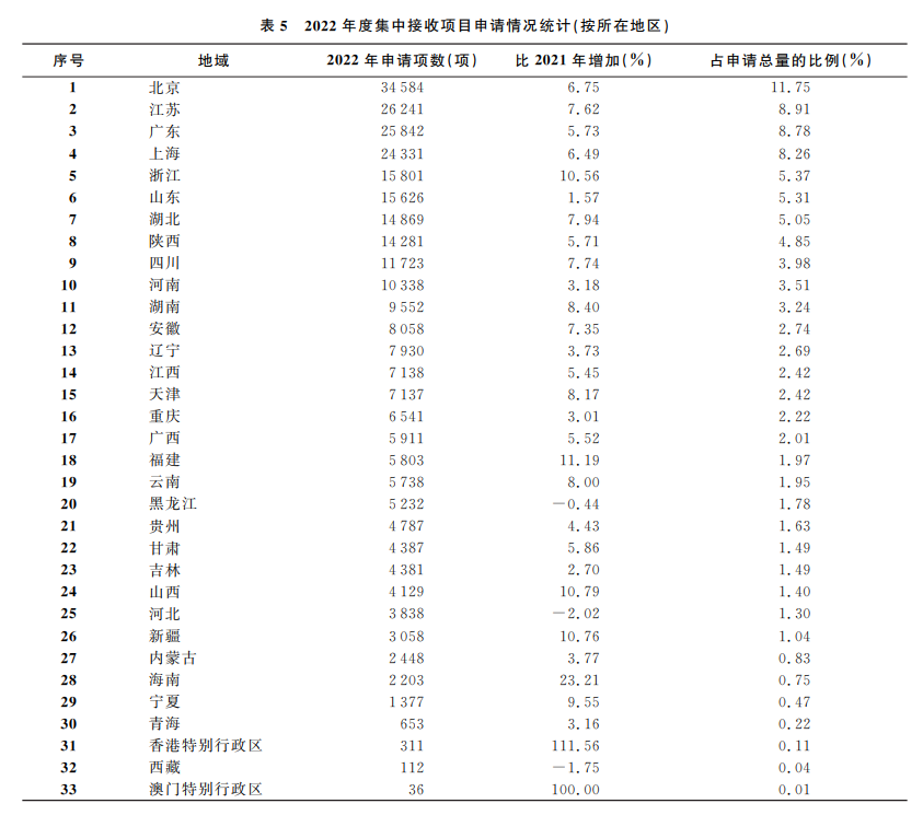 据统计,2022年项目申请集中接收期间,来自北京的项目申请量最多,占申请总量的 11.75%,其次是江苏、广东、上海和浙江。来自上述五个地区的项目申请量占项目申请总量的43.07%,项目申请的区域集中特点明显。