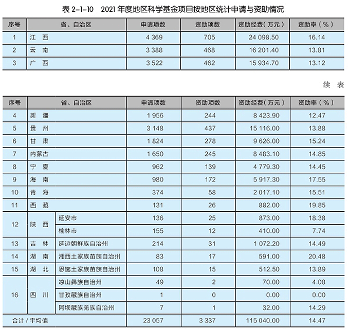 由于2022年国自然资助结果尚未公布,因此选用2021年数据,可以看出各地区面上、青年和地区项目资助数、资助率有不小的差异。